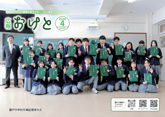 広報おけと4月号を掲載しました 2026年4月1日(水) お知らせ 広報おけと4月号表紙 今月号の表紙は「置戸中学校卒業証書授与式」です。下記のリンクよりダウンロードしてご覧いただけます。 令和8(2026)年度 このページの情報に関するお問い合わせ先 置戸町役場 企画財政課TEL:0157-52-3312FAX:0157-52-3353