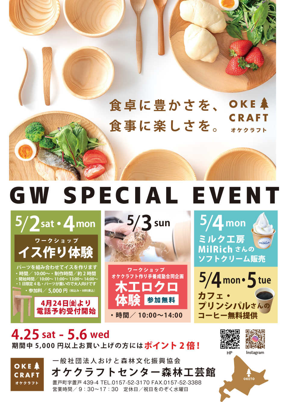 今年のゴールデンウィークは、置戸が誇る「オケクラフト」の世界をたっぷり楽しみませんか?職人の技に触れる体験会や美味しいものが大集合!期間中は休まず営業いたします。